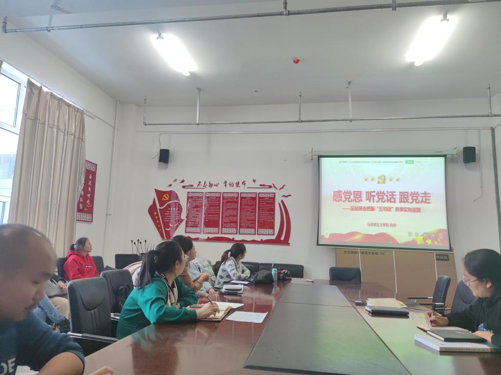 为全面学习宣传贯彻党的二十大精神,全力推动“感党恩、听党话、跟党走”群众教育实践活动走深走实要求,12月13日下午,bevictor伟德教师党支部在崇文楼B123会议室开展“五句话”的事实和道理主题宣讲活动,公司中国近现代史纲要课程教研室主任张舒作专题报告,公司全体教师参加学习。