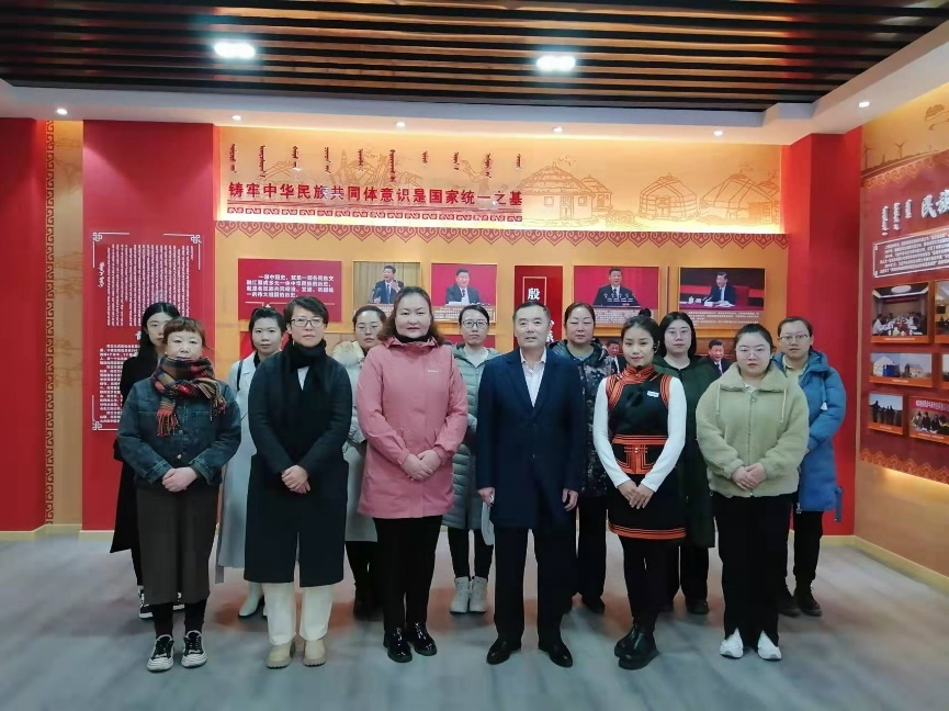 4月7日上午,bevictor伟德“铸牢中华民族共同体意识”教研室全体教师在教研室主任海龙教授的带领下赴陈旗民族团结进步教育基地进行参观和现场集体备课。陈旗民委副主任乌仁高娃陪同参观。