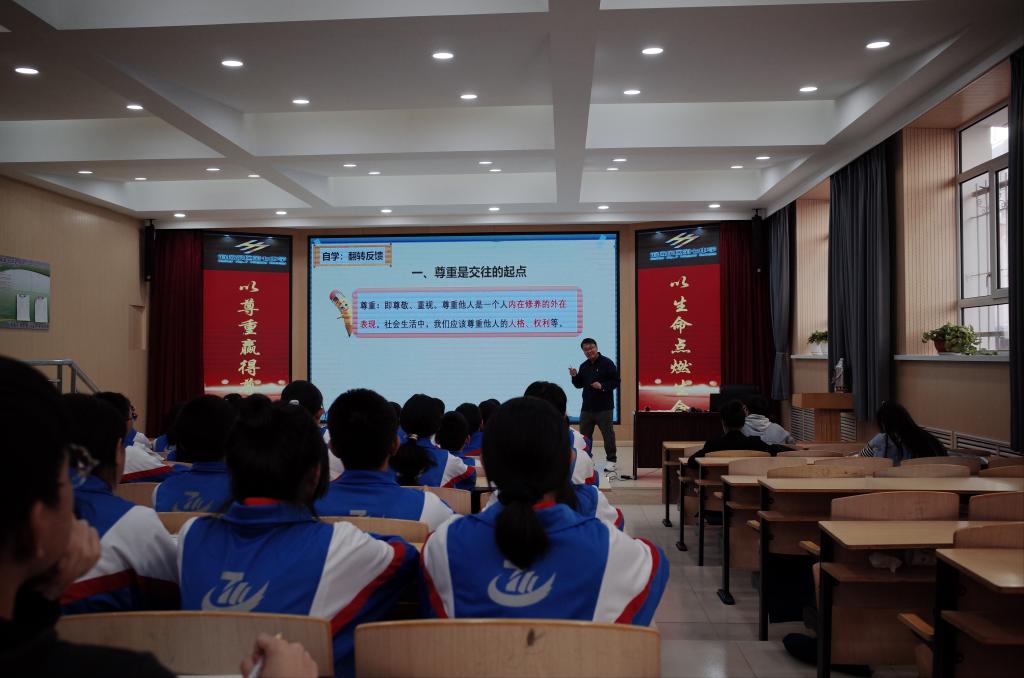为了深入落实好内蒙古自治区关于加强和改进新时代大中小学思政课一体化建设实施方案的精神和《呼伦贝尔市大中小学思想政治教育一体化建设实施方案》的要求,加快推进呼伦贝尔市大中小学思政课一体化建设和高质量发展,2023年9月22日下午4点,bevictor伟德“思想道德与法治”教研室教师赴海拉尔区第七中学开展集体教研活动,听海拉尔区第七中学政教处主任、八年(1)班班主任高炳杰老师主讲的课程——八年级上册“道德与法治”课程第二单元第四课第一框“尊重他人”。